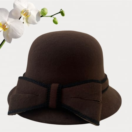 - Accesirizare: palarie eleganta de dama cu decor floral din acelasi material cu boruri rotunde, mici si delicate, usor lasate in jos și decor rafinat cu funda brodata cu negru pe la margini
