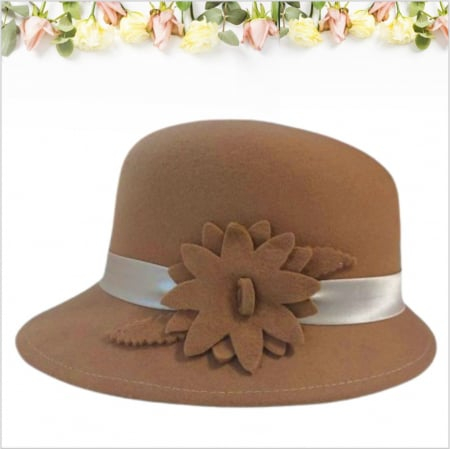 Accesorizare: panglica din satin de lux lata de aproximativ 3 cm de jur imprejur ,elegant decor tip stea stilizata din fetru in culorea palariei, de aproximativ 5-6 cm, asezat lateral