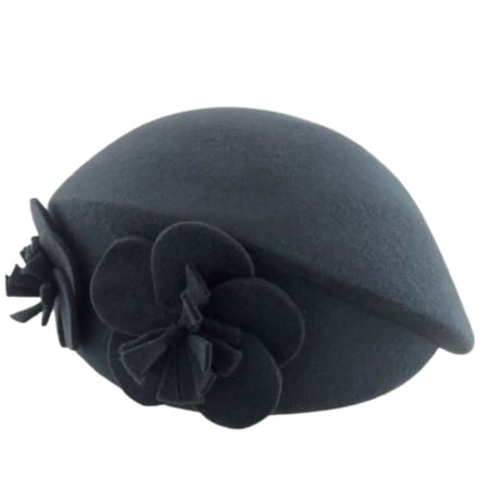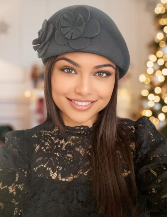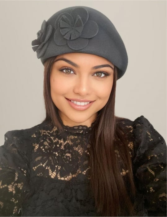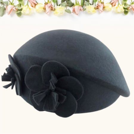 • MODEL: palarie dama tip toca cu croiala moderna pe colt si delicate accesorii florale